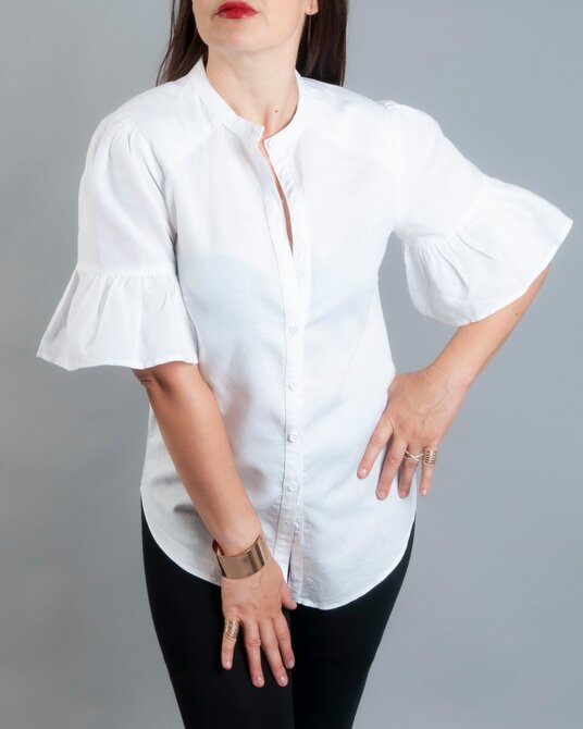 | Be the drama in this white linen blouse. With exaggerated sleeves and a slim cut silhouette and finished beautifully with a four hole button resembling a simplistic flower. | | |